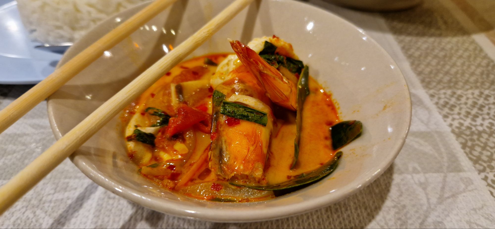 - We keep on exploring Thai cuisine, enjoying every Padthai (the famous all-in noodle dish), Pad See Ew (another delicious noodle dish), Tom Yum (bright red shrimp curry) and Massaman curry (a soft curry with potatoes). My low tolerance to spices prevents me unfortunately from trying out two-thirds of the Thai dishes – the remaining safe third is delicious, so that’s fine by me!